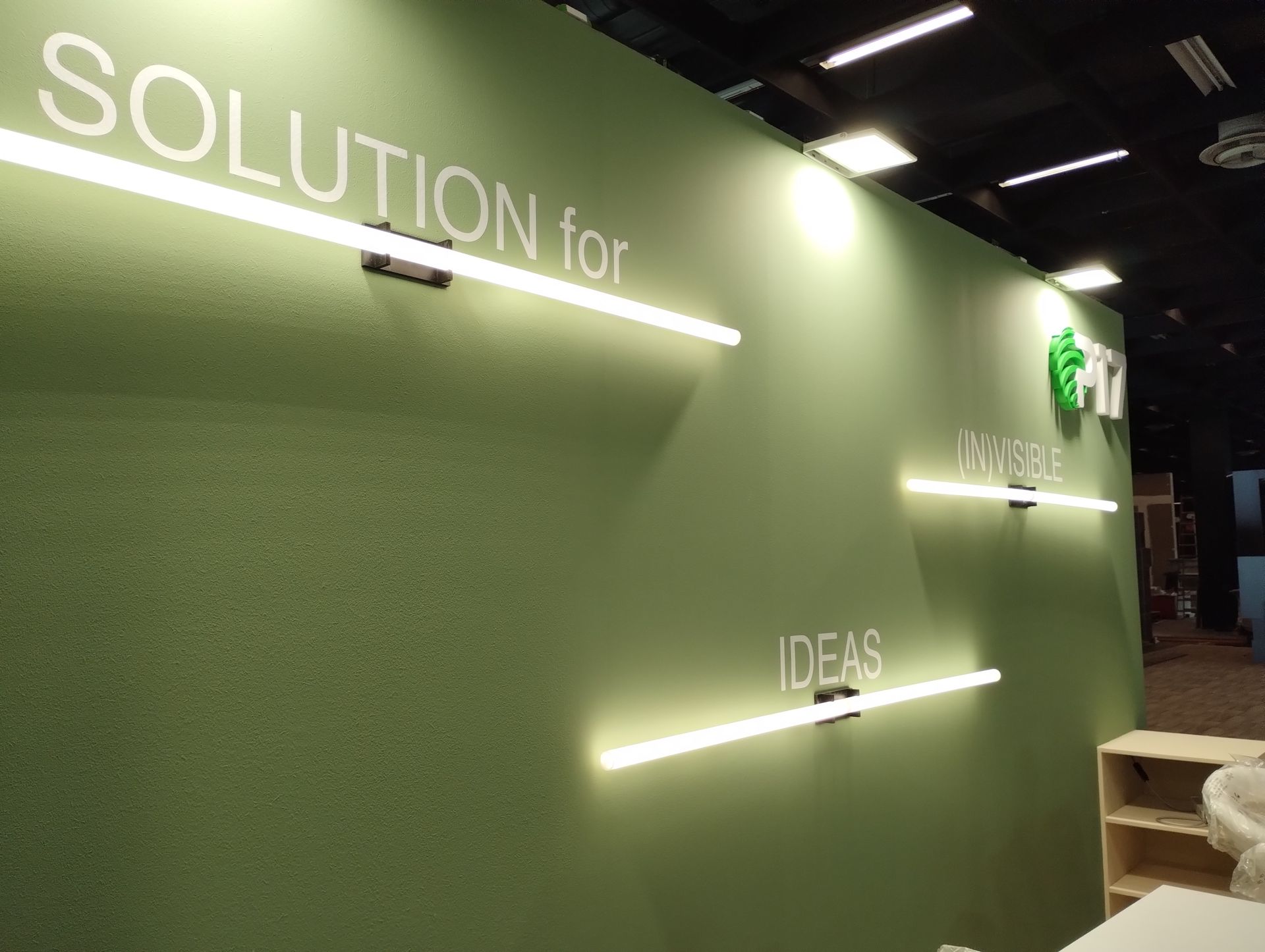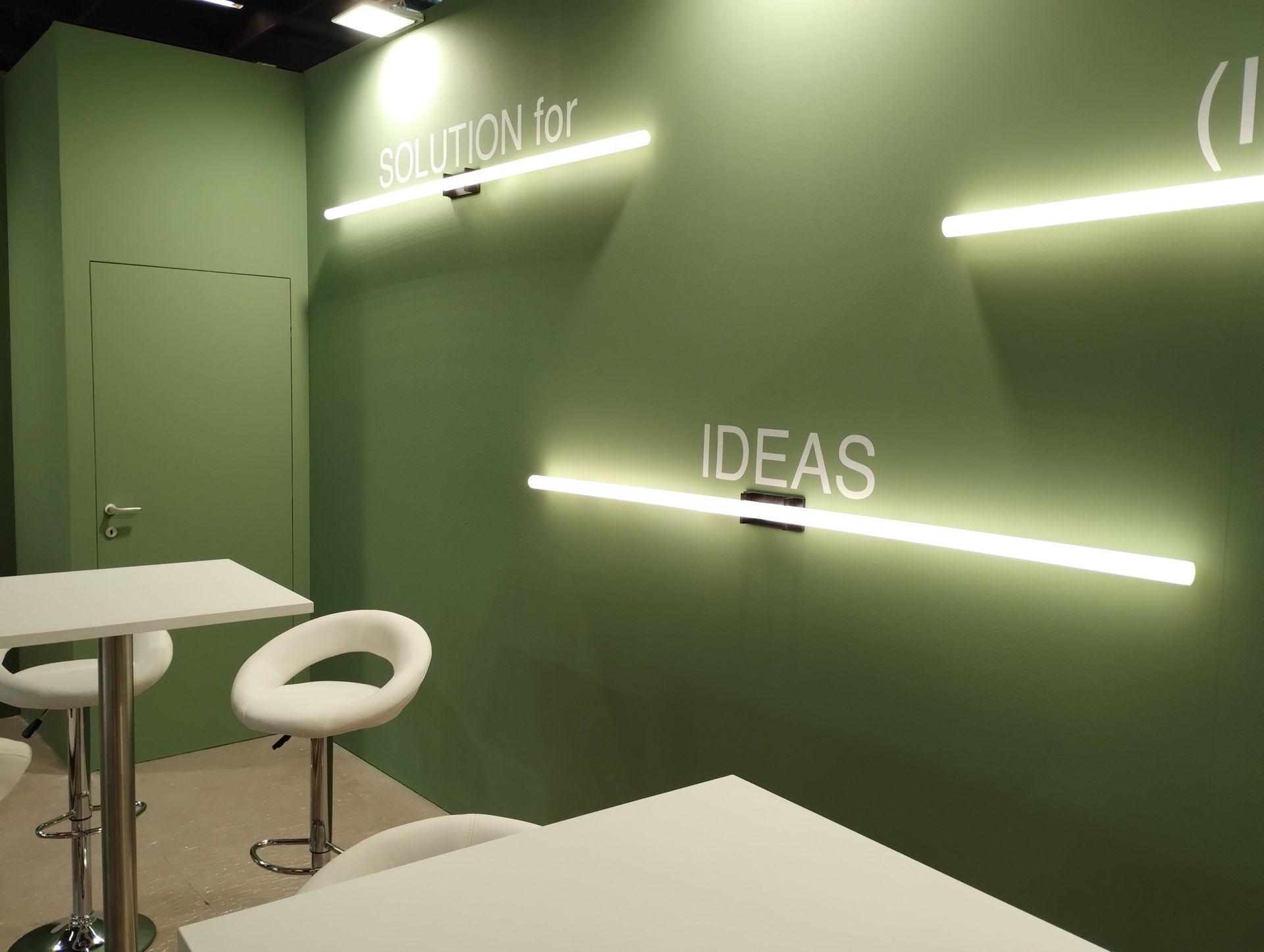 Uno stand semplice ma con una accurata ricerca di colori, materiali e dettagli, come ad esempio i tubi applique totalmente luminosi da 200 cm di larghezza, già ideati e realizzati da Avntgard, per mettere in massima evidenza il prodotto esposto.