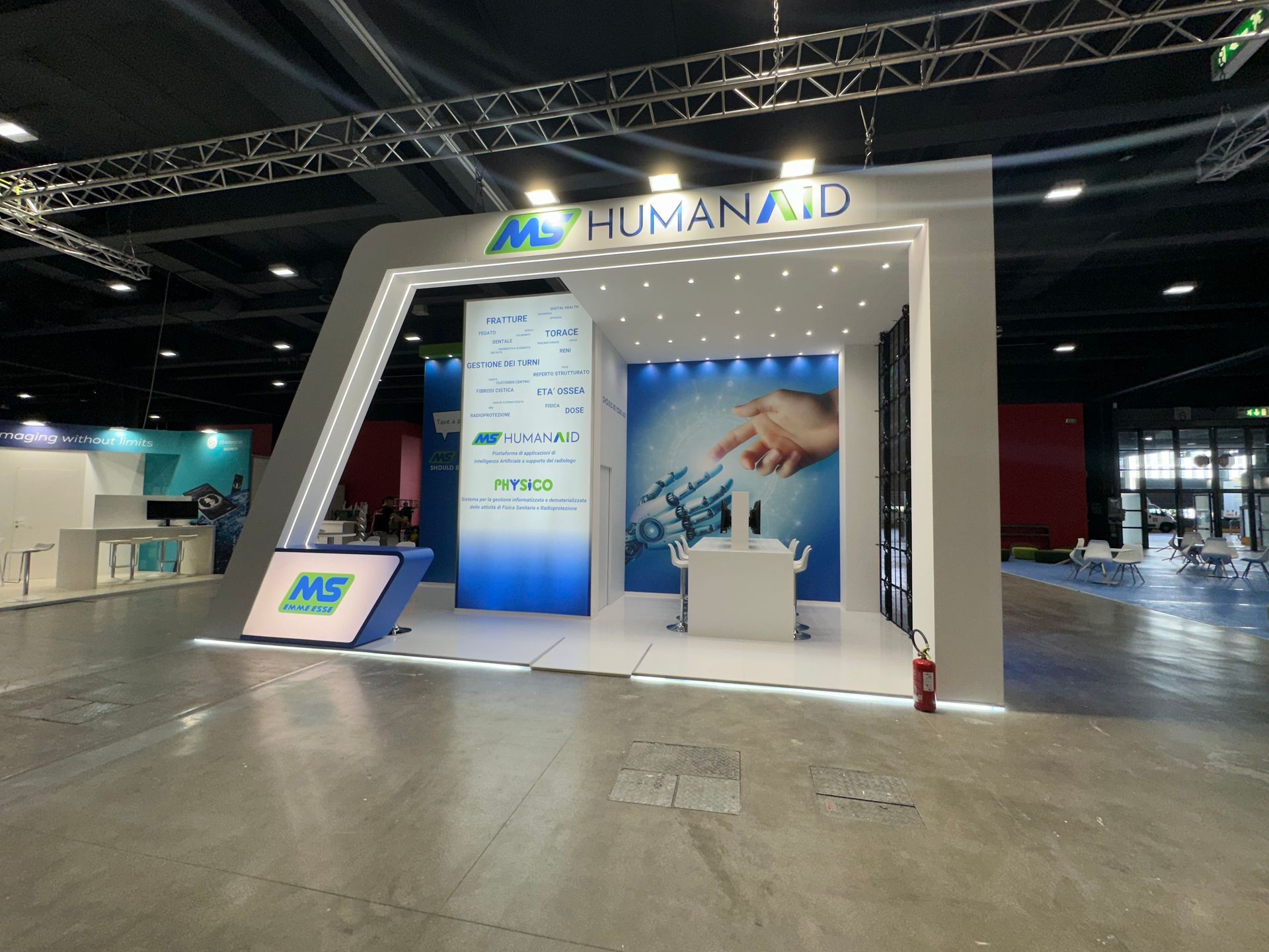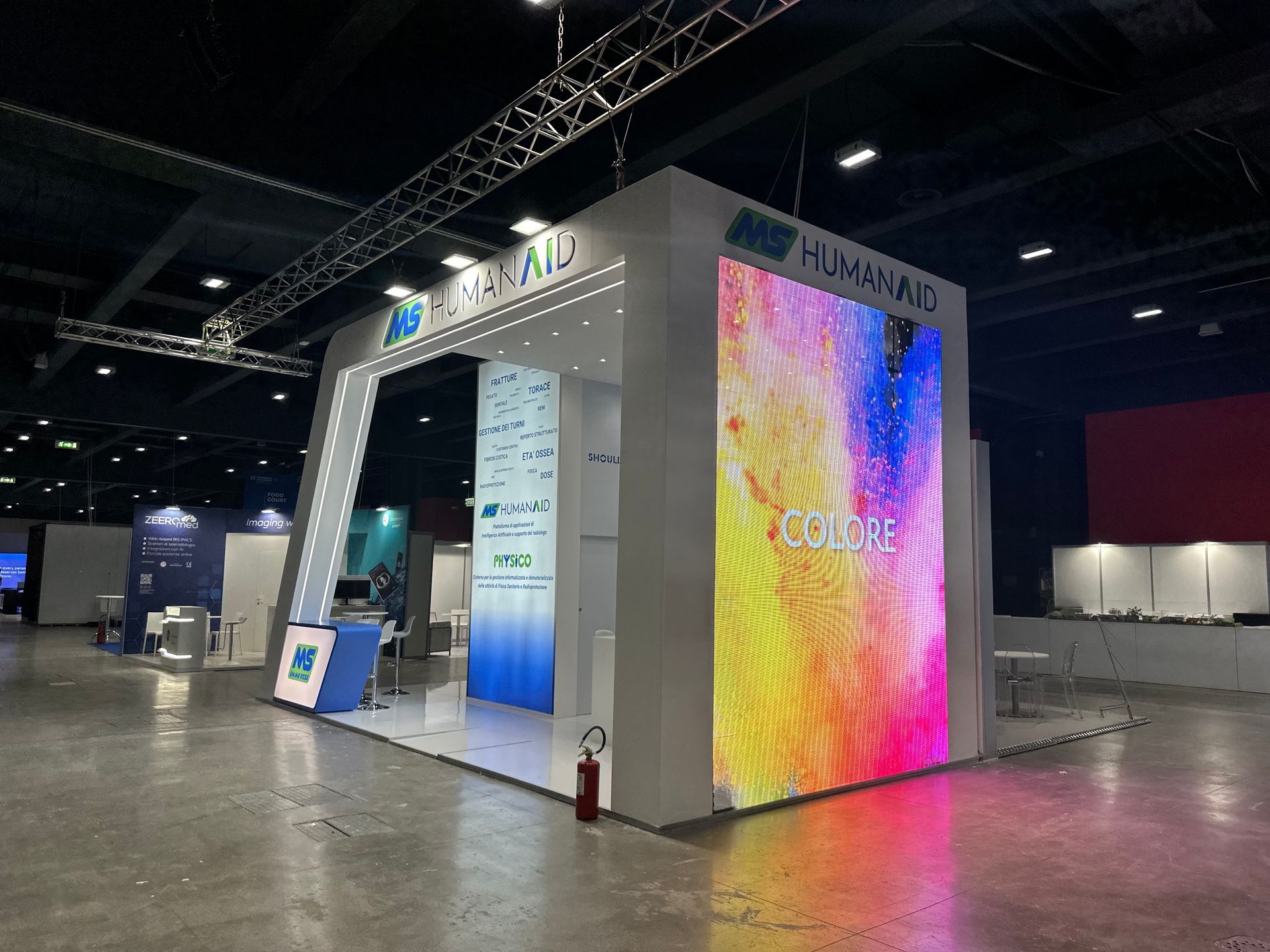 Completano lo stand diversi elementi luminosi, come il desk e il logo e una postazione demo appositamente studiata con tavolo alto, schermi