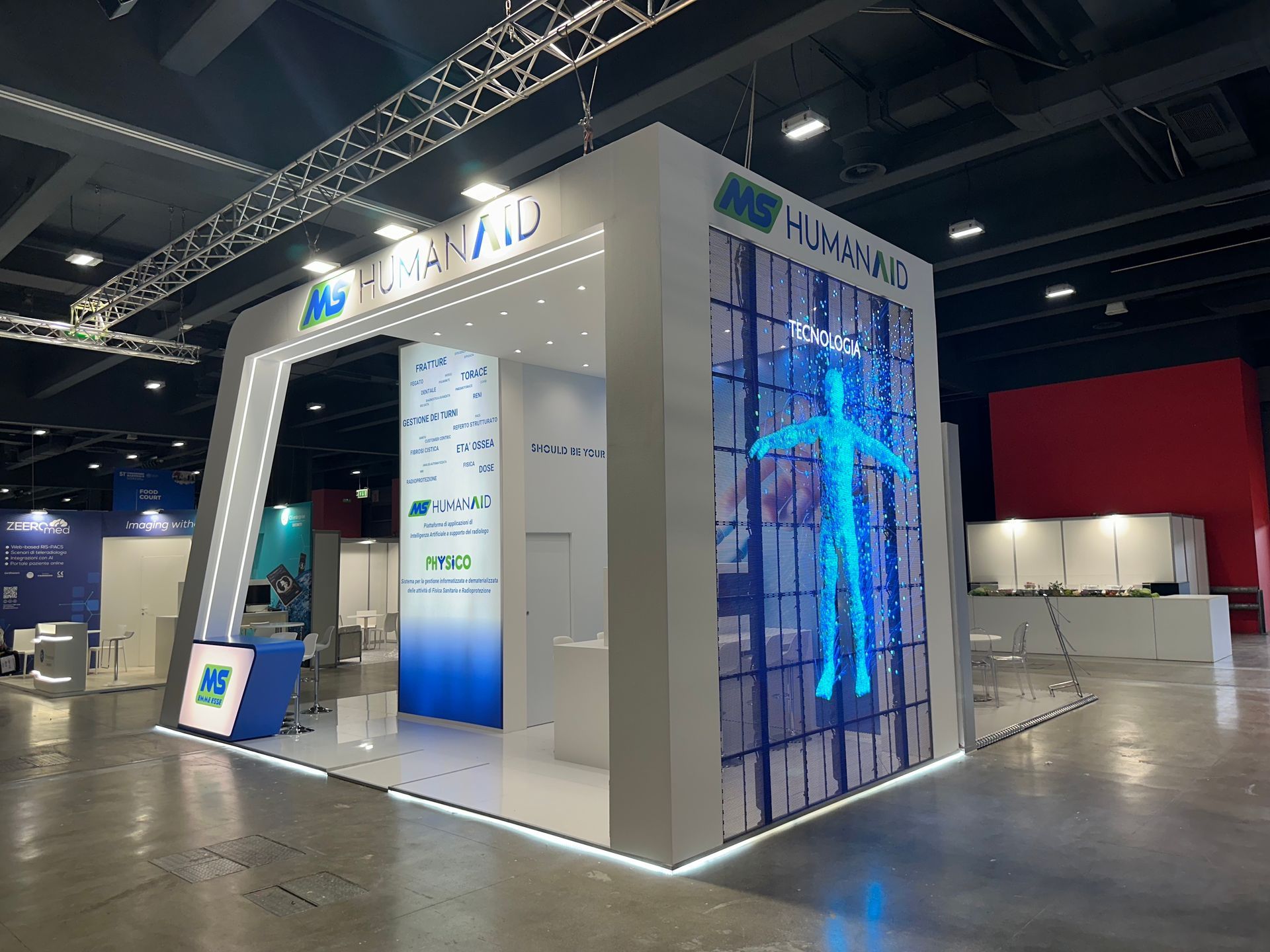 Lo stand, interamente dedicato ad un sistema di AI, ha come focus un ledwall trasparente alto 4m che proietta video con effetto 3d.