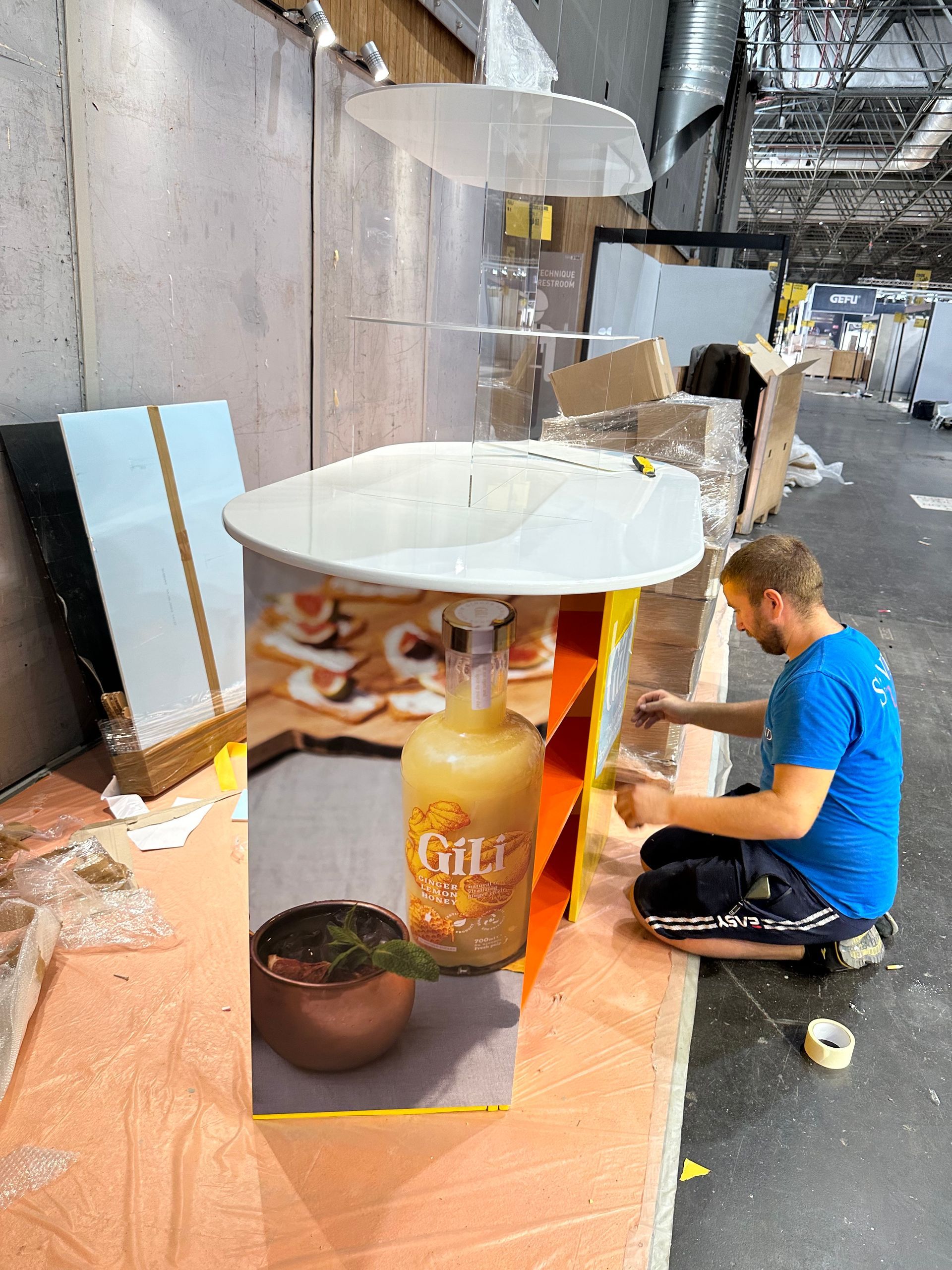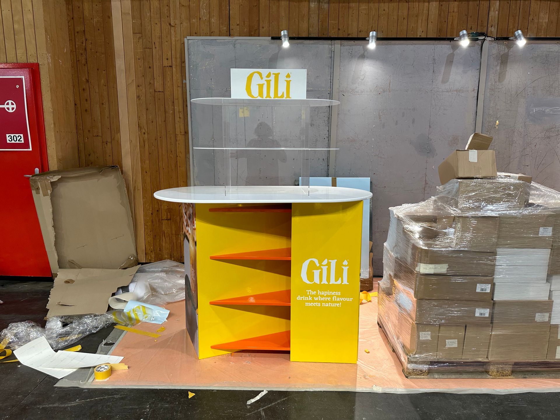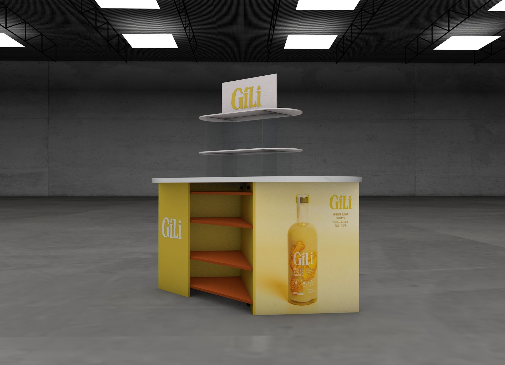 La belga GILI DRINKS, che produce bevande dai gusti molto particolari e alcohol-free, ci ha chiesto di progettare e produrre un bancone da bar/negozio facilmente trasportabile, con capacità di stoccaggio, comunicativo e bello. Abbiamo creato un freestanding composto da 2 pezzi interamente laccati lucidi che assemblati insieme costituiscono la base del banco. Al suo interno ci sono 8 mensole per poggiare i drink e sulla parte esterna, degli spazi verticali studiati per poter applicare delle grafiche intercambiabili. Sopra la struttura un grande piano laccato bianco e un sistema di piedistalli in plexiglass da comporre in base alle esigenze. La sua semplicità di montaggio/smontaggio, trasportabilità, modularità e capacità di cambiare veste grafica, rende questo banco un oggetto strategico per la promozione in eventi, corner, fiere.. e un oggetto attrattivo da esporre in vetrina e negozio.