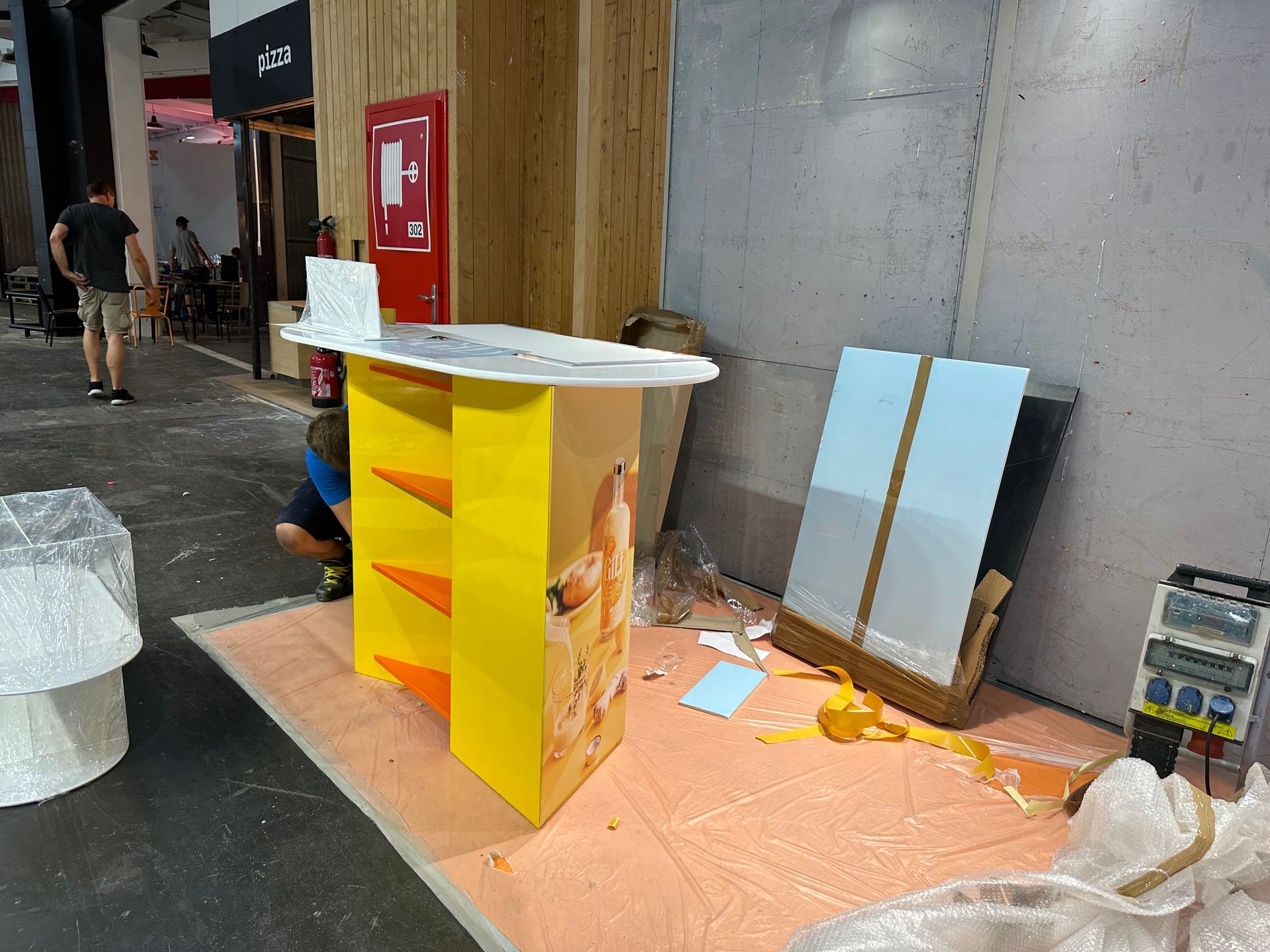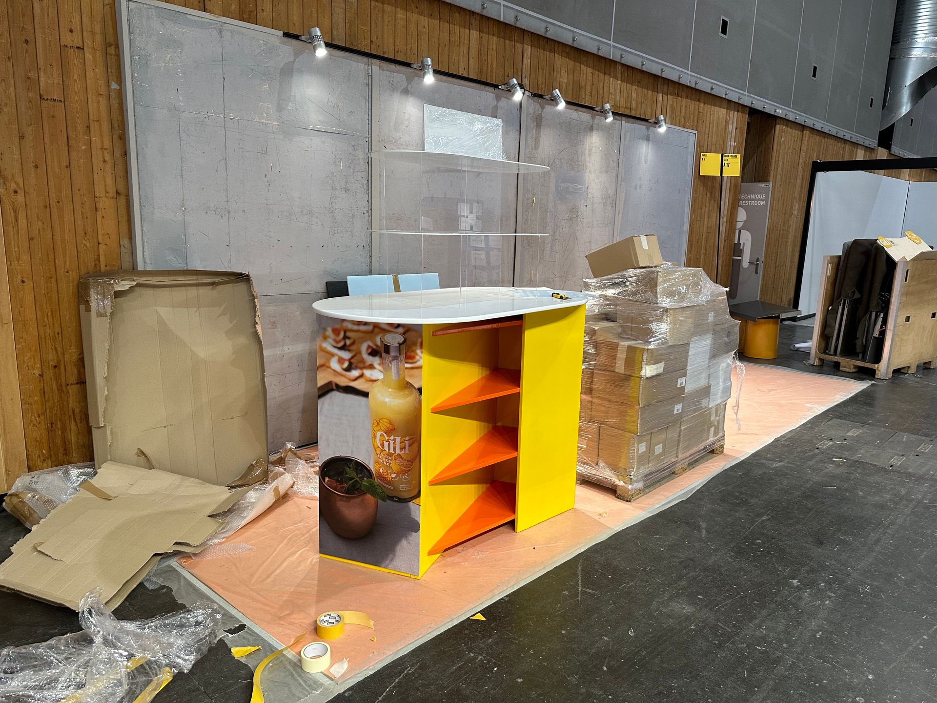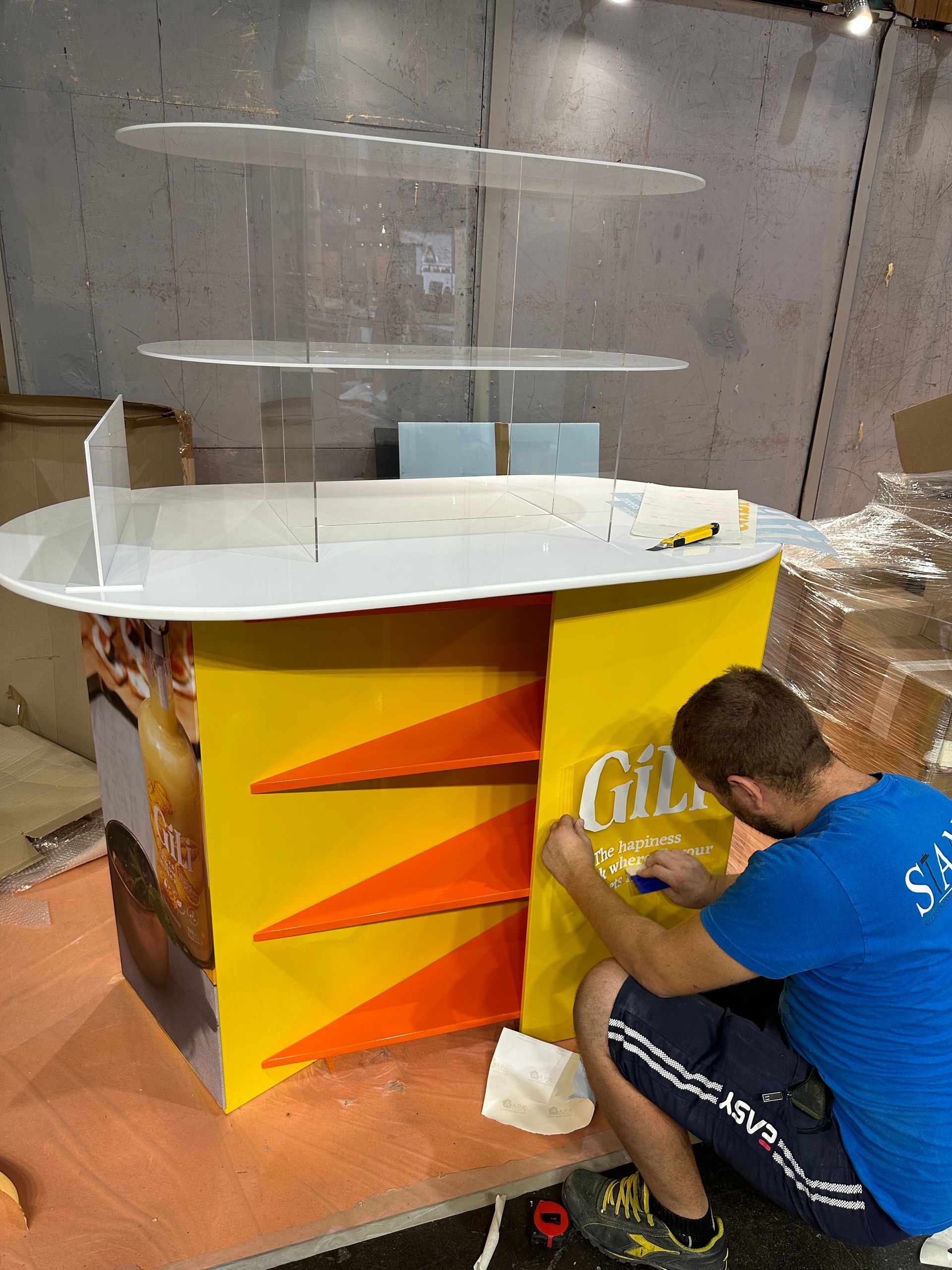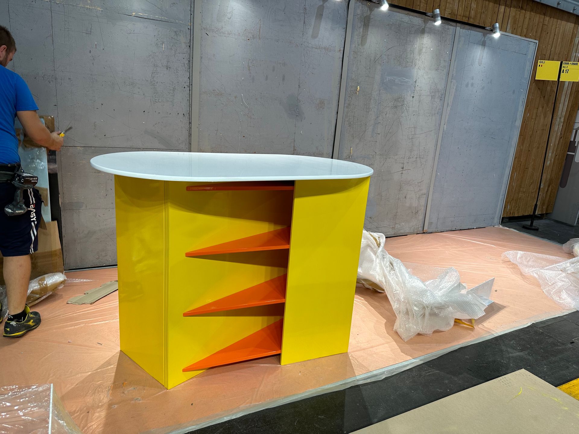 La belga GILI DRINKS, che produce bevande dai gusti molto particolari e alcohol-free, ci ha chiesto di progettare e produrre un bancone da bar/negozio facilmente trasportabile, con capacità di stoccaggio, comunicativo e bello. Abbiamo creato un freestanding composto da 2 pezzi interamente laccati lucidi che assemblati insieme costituiscono la base del banco. Al suo interno ci sono 8 mensole per poggiare i drink e sulla parte esterna, degli spazi verticali studiati per poter applicare delle grafiche intercambiabili. Sopra la struttura un grande piano laccato bianco e un sistema di piedistalli in plexiglass da comporre in base alle esigenze. La sua semplicità di montaggio/smontaggio, trasportabilità, modularità e capacità di cambiare veste grafica, rende questo banco un oggetto strategico per la promozione in eventi, corner, fiere.. e un oggetto attrattivo da esporre in vetrina e negozio.